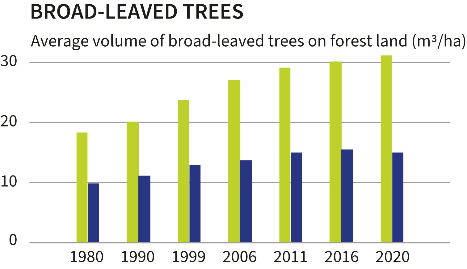 The desire of the wood processing industry to invest in Finland has long encouraged forest owners to take care of the vitality of forests and increase forest resources. The volume of growing stock on forest land (forests available for wood supply and protected forests) has increased by 50 per cent over the past 40 years. The positive trend is visible in various tree species. The volume of broad-leaved trees has almost doubled in southern Finland.