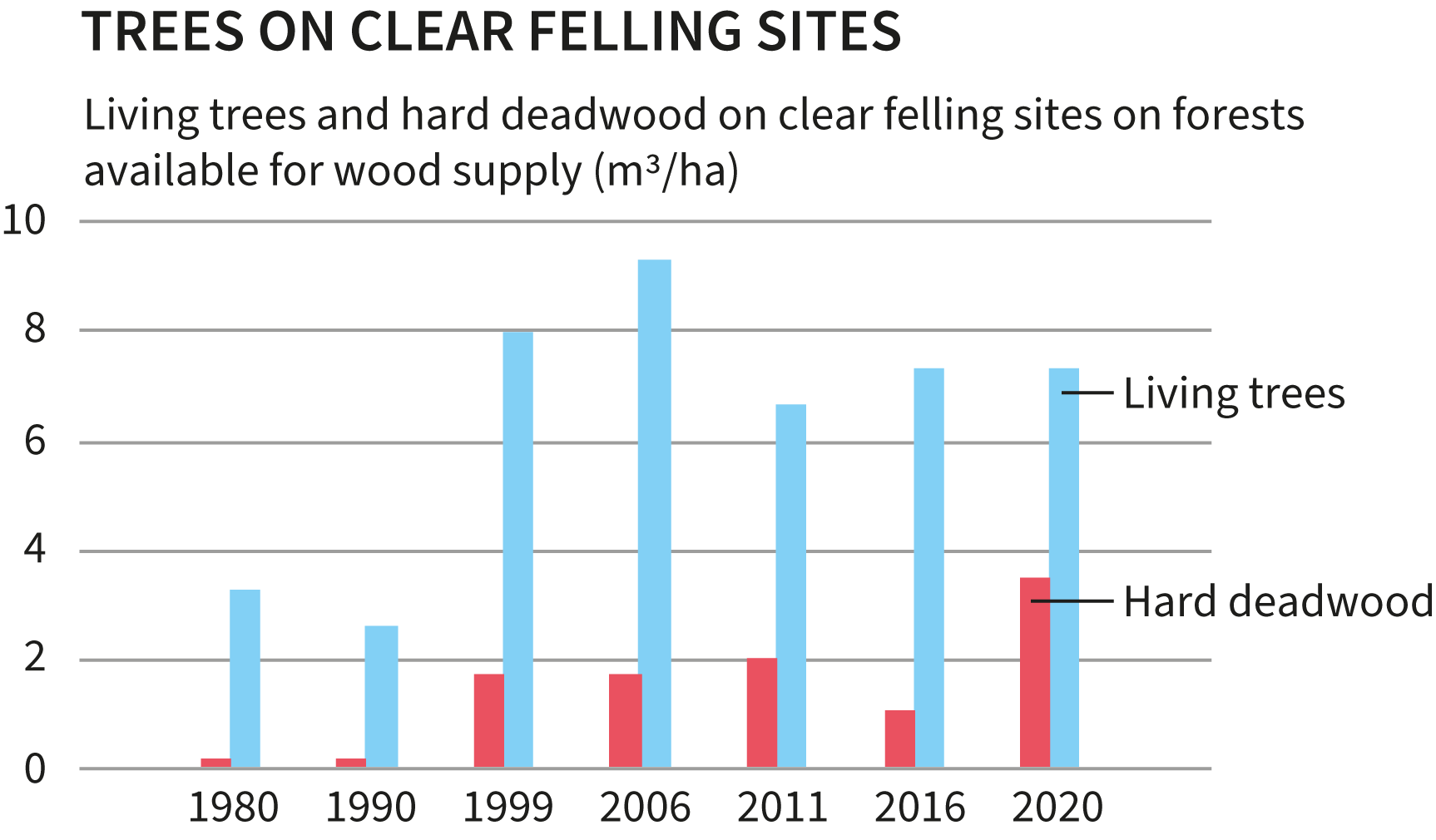 The extensive introduction of forest certification in Finland has made retention trees part of forest management. Mainly for this reason, the volume of living trees spared on clear felling sites has almost tripled in our managed forests over the past 30 years.