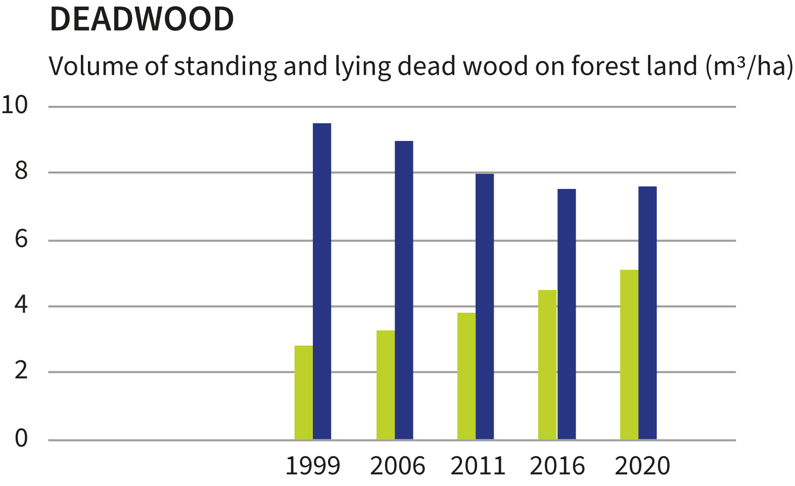 Nowadays removal of dead wood is avoided in felling, and retention trees are left on felling sites, leading to increased amount of dead wood in forest in the long term. The amount of dead wood in northern Finland has decreased in both forests available for wood supply and protected forests as there has been no large-scale storm damages for decades in the north. However, the latest inventories show that the downward trend has come to a halt.
