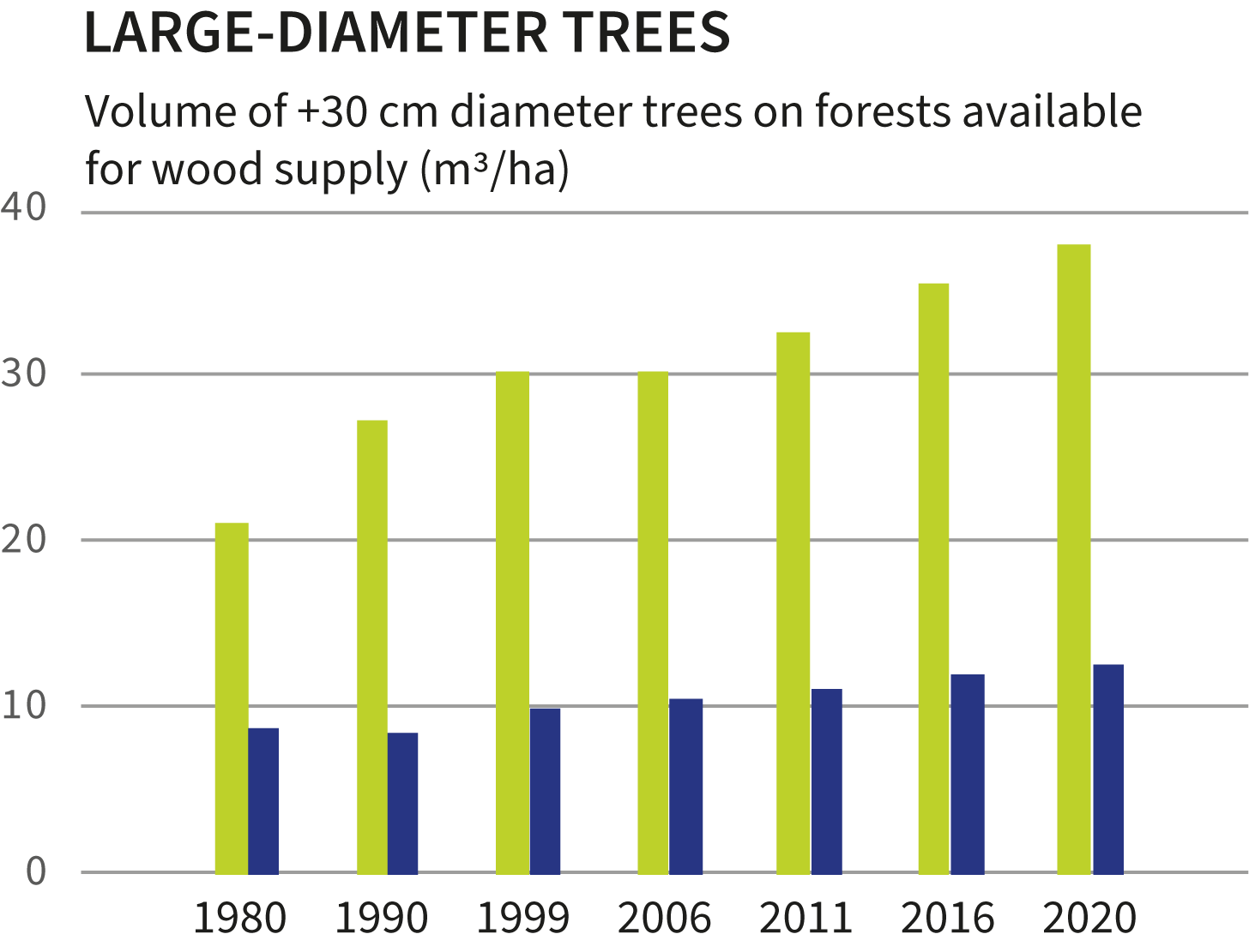 The total volume of large-diameter trees has increased, almost doubling in southern Finland, since the 1980s.