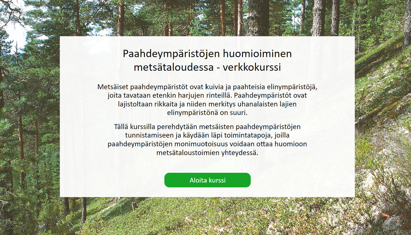 Tutustu paahdeympäristöjen tunnistamiseen ja hoitoon metsäalan toimijoille suunnatulla verkkokurssilla. Varaa kurssin yhtäjaksoiseen suorittamiseen noin 30 minuuttia. Kurssin ovat toteuttaneet Tapio Palvelut Oy ja Hämeen ammattikorkeakoulu.